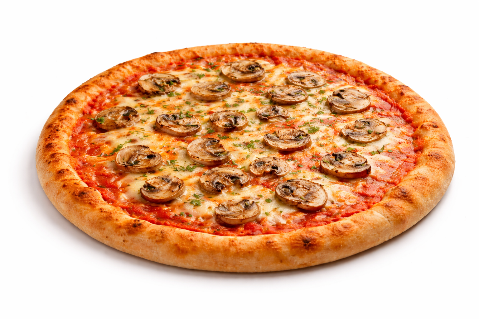 De Funghi pizza wordt bereid met rijke tomatensaus, gesmolten mozzarella en vers gesneden champignons op ons ambachtelijk bereid deeg, voor een heerlijke aardse smaak bij elke hap.