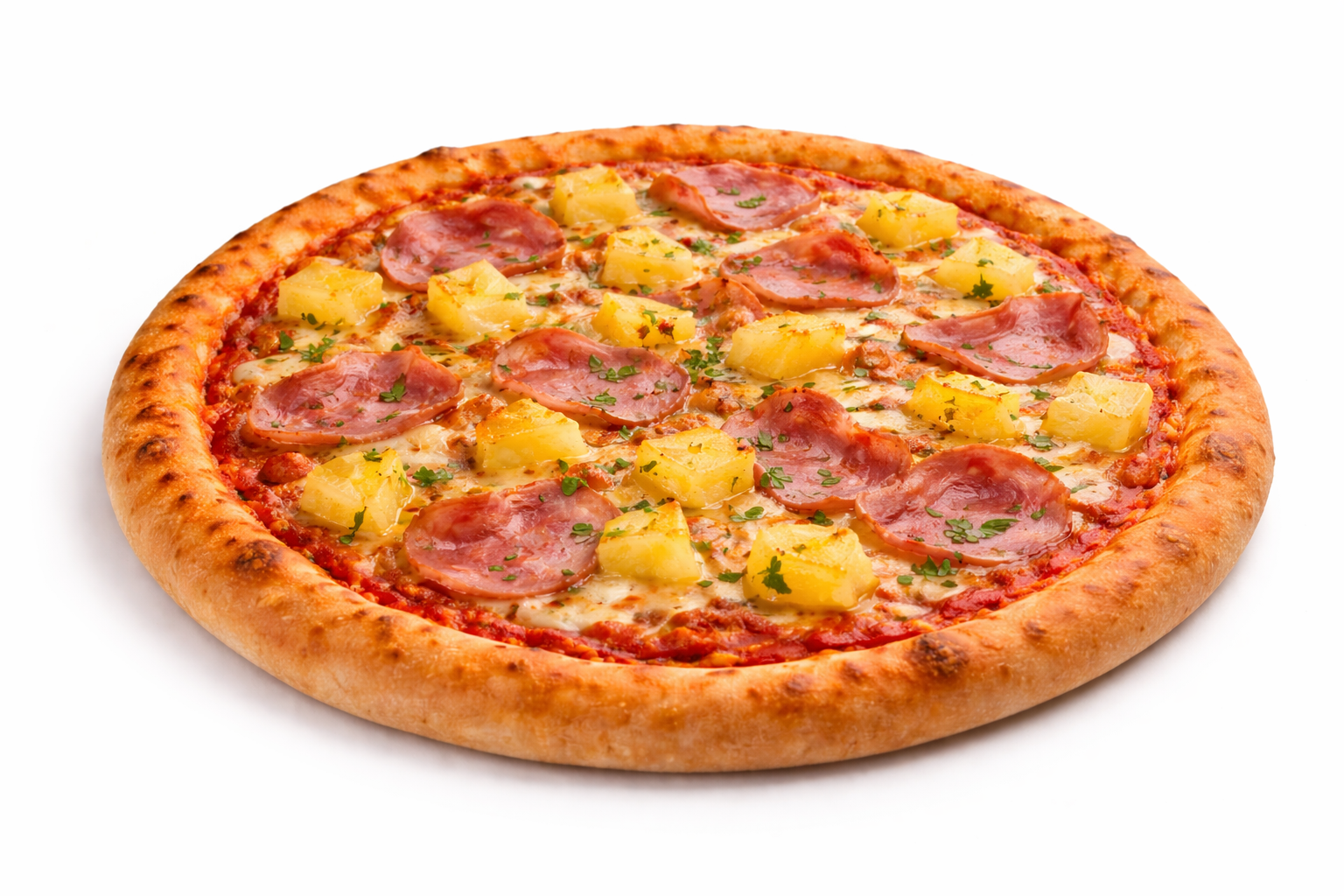 Premium ham en zoete ananas op tomatensaus met gesmolten mozzarella.