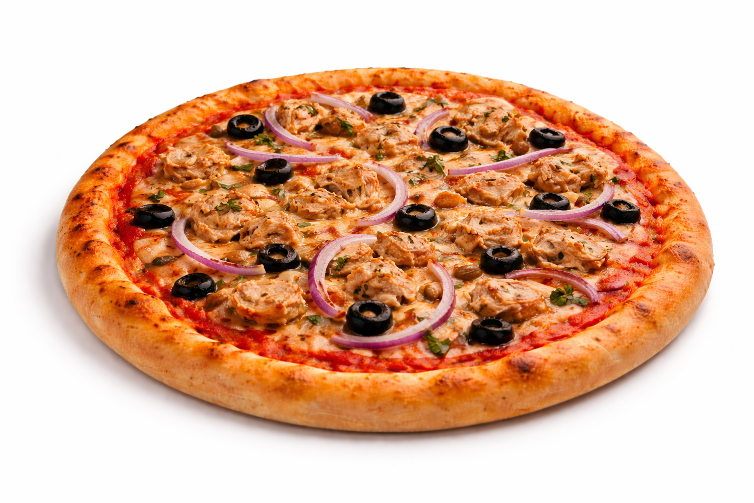 Verse tonijn gecombineerd met rode uien, olijven en gesmolten mozzarella op een rijke tomatensaus.
